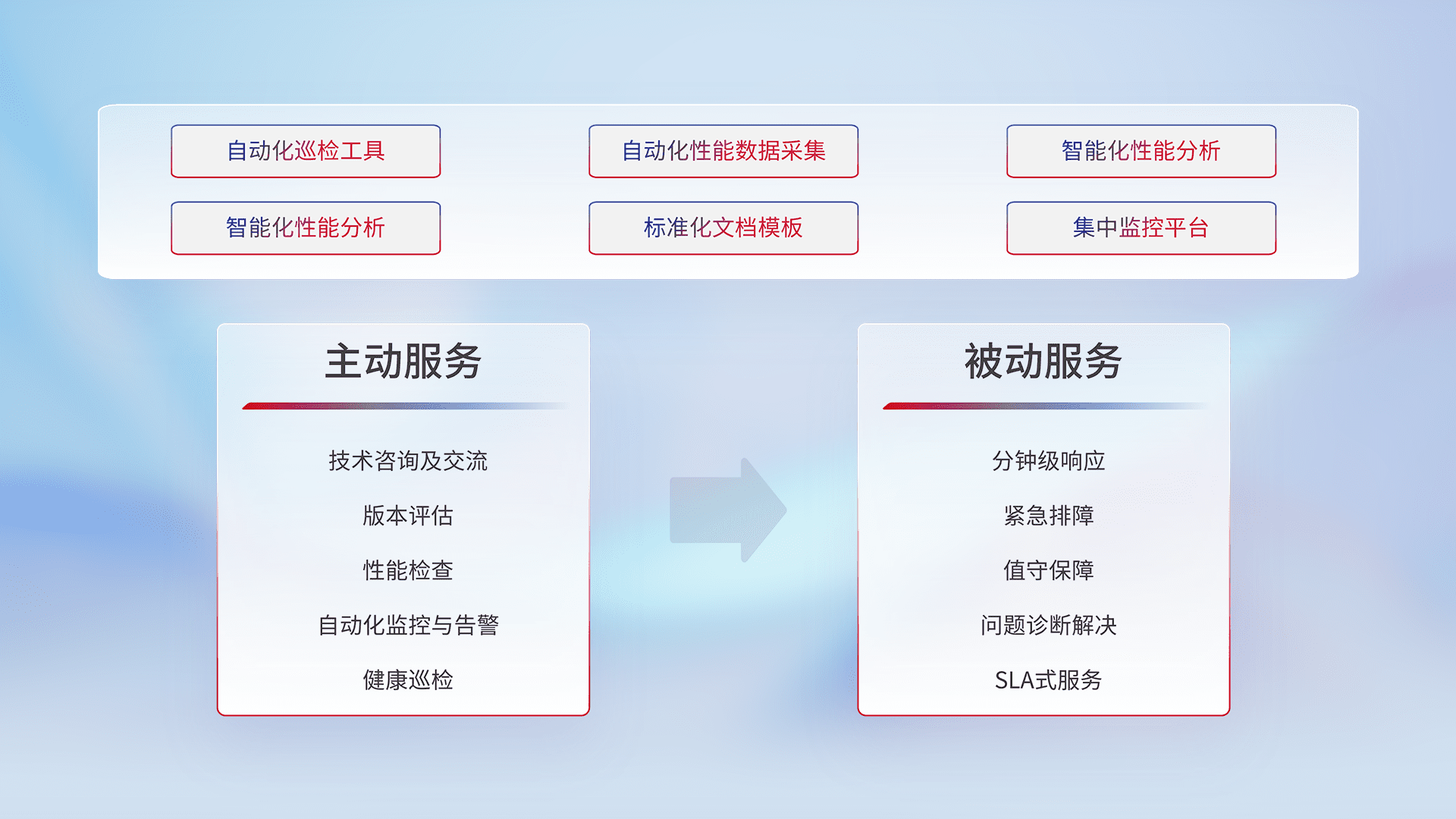 智能化工具和标准化文档,,,,保障服务质量,,提供主动服务(包含技术咨询、、、、版本评估、、、性能检查、、、、自动化监控与告警、、健康巡检)和被动服务包含(分钟级响应、、、紧急排障、、、、值守保障、、问题诊断解决、、、SLA服务)。。。。